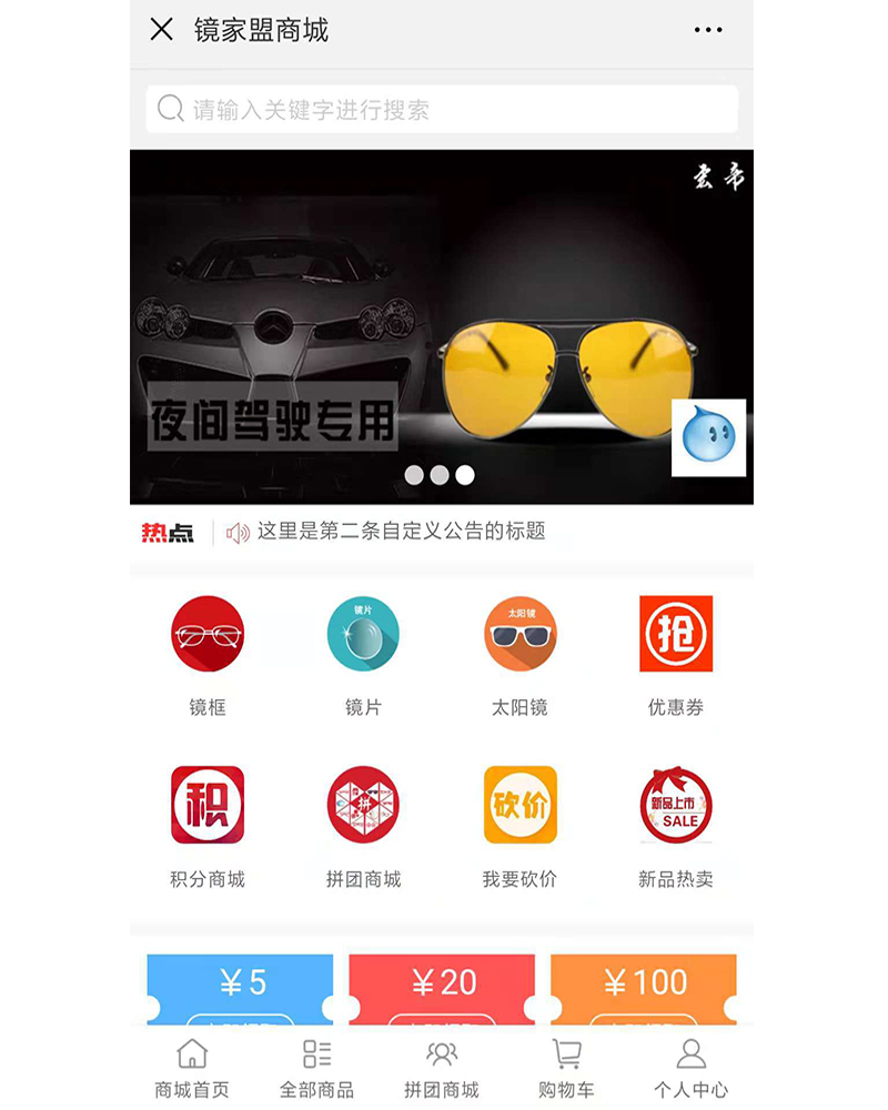 該應(yīng)用是專為眼鏡愛好者的購物公眾號(hào),設(shè)計(jì)開發(fā)積分商城、拼團(tuán)、砍價(jià)等功能模塊。